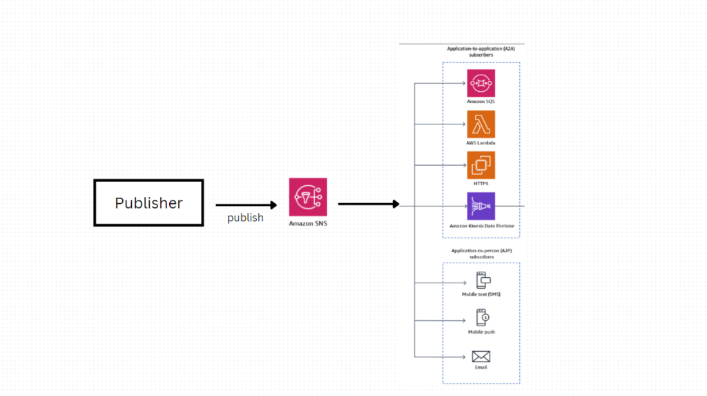 We created a topic earlier. A message published to this topic can be consumed by a subscriber. Subscribers can be of a few types, including an email subscriber, an SMS subscriber, an HTTP endpoint, an SQS queue, and so on.